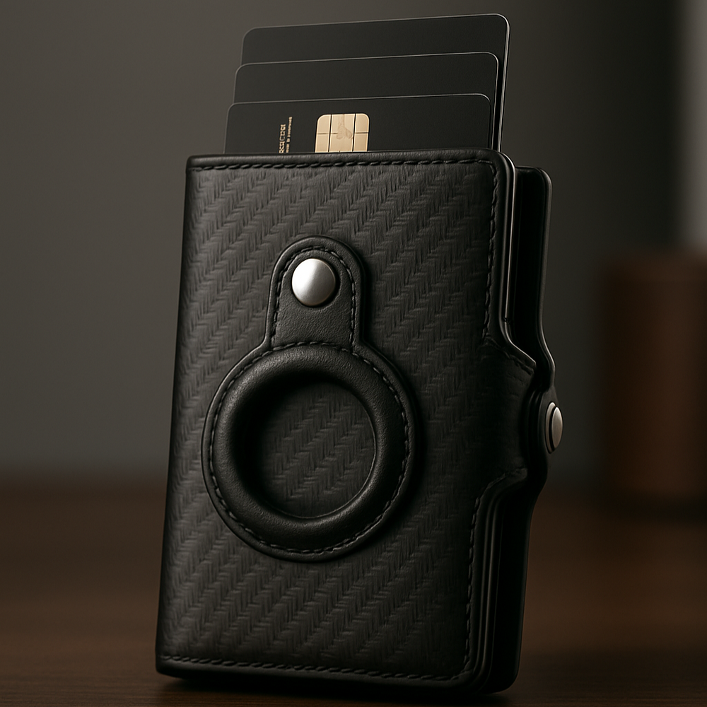 Crafted from premium materials, the wallet protects your cards against digital scanning while keeping them neatly arranged. The quick-access card ejector flips your cards up with a single press, making it effortless to grab what you need, all while maintaining a sleek, minimalist profile.